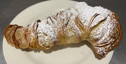Lobster Tail: Flaky puff pastry filled with a mix of cream filling and Bavarian cream, finished with powdered sugar. $5.25