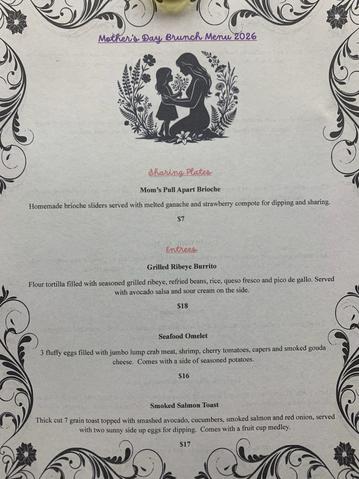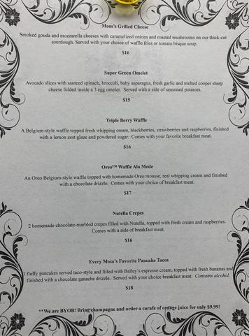 We are now taking reservations for our famous Mother's Day Brunch on Sunday May 10th. Call ahead to reserve a table. Here's a sneak peek at our Mother's Day Brunch Menu! We are BYOB, so bring a bottle of your favorite champagne and order a carafe of orange juice to celebrate mom!